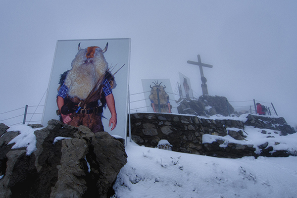 So war es wohl auch der Gipfel der Fotogefühle für die vielleicht fünfzig Besucher, die sich am Mittwoch dem 23. Mai 2013 auf das Nebelhorn (2224m) getraut haben, das – wieder einmal in dichtem Nebel gehüllt – seinen Namen alle Ehre machte. Nur schemenhaft war unter dem Gipfelkreuz die Installation der überdimensionalen Bilder, die der Fotograf und Initiator des 1. Oberstdorfer Fotogipfels Christian Popkes, von den Oberstdorfer Klausen, einer einheimischen Brauchtumsgruppe aufgenommen hatte zu erahnen. Passend zu den geradezu archaisch anmutenden Gestalten zeigte sich die über das frisch verschneite Gipfelareal verteilte Installation nur schemenhaft, geheimnisvoll in Nebelschaden gehüllt. Eindrucksvoller hätte es sich kein Event-Manager oder Fotograf ausdenken können.