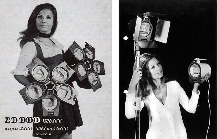 1968 auf der photokina: Vorstellung der DeLuxe 2000, der weltweit ersten Halogen-Filmleuchte mit Gebläsekühlung. Daneben eine Werbeaufnahme aus den 60er Jahren mit DeLuxe 2000 und dem Schwestermodell Ventilux 1250.