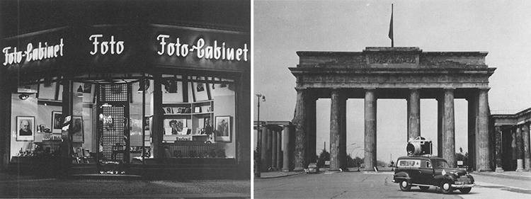 Foto-Cabinet: Otto Hedlers erstes Atelier am Kurfürstendamm in Berlin, eröffnet 1945 (l) und Opel Olympia Kastenwagen der Firma Foto Hedler mit Praktina Werbemodell auf dem Dach vor dem Brandenburger Tor, noch ohne die wiederaufgestellte Quadriga – Aufgenommen in den frühen 50er Jahren.