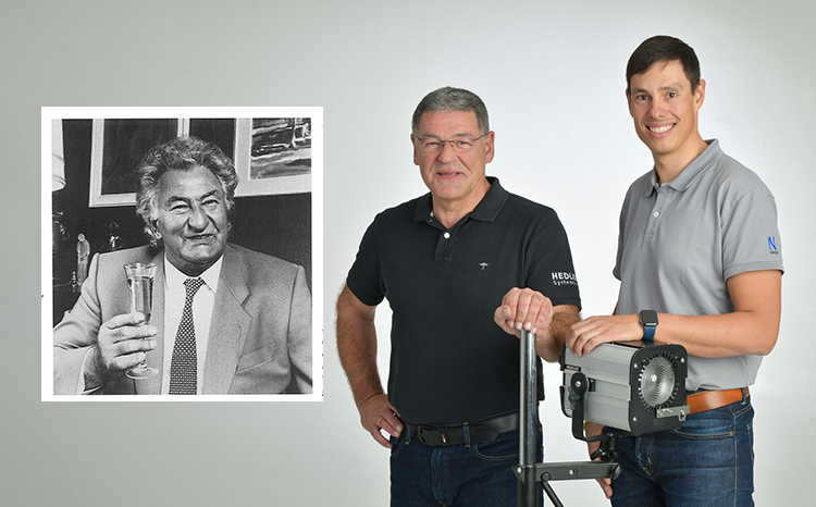 Portrait des Firmengründers Otto Hedler sowie sein Sohn Thomas zusammen mit Novoflex Geschäftsführer Michael Hiesinger bei der Übernahme der Hedler Systemlicht GmbH.