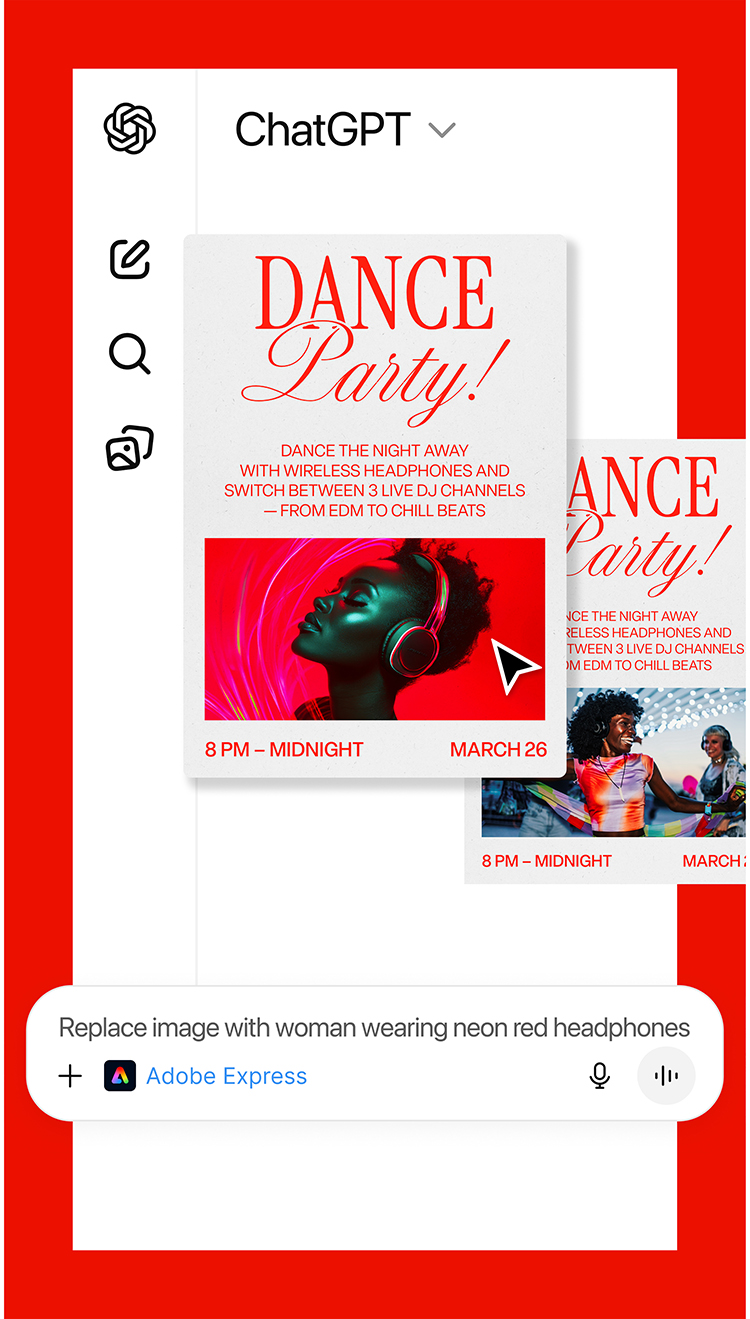 Helligkeit, Kontrast oder Belichtung anpassen, bestimmte Bildbereiche selektiv bearbeiten oder kreative Effekte wie Glow oder Glitch anwenden – alles steuerbar über einfache Chat-Kommandos. Die Qualität der Originaldateien bleibt dabei erhalten. - Design-Erstellung mit Adobe Express