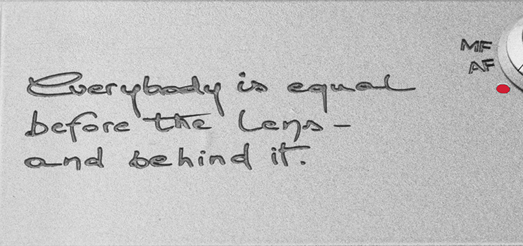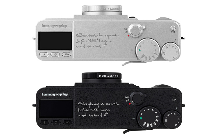Jeder ist gleich, ob vor oder hinter der Linse. Gravur auf der Oberseite der Lomo MC-A 35mm Analogkamera.