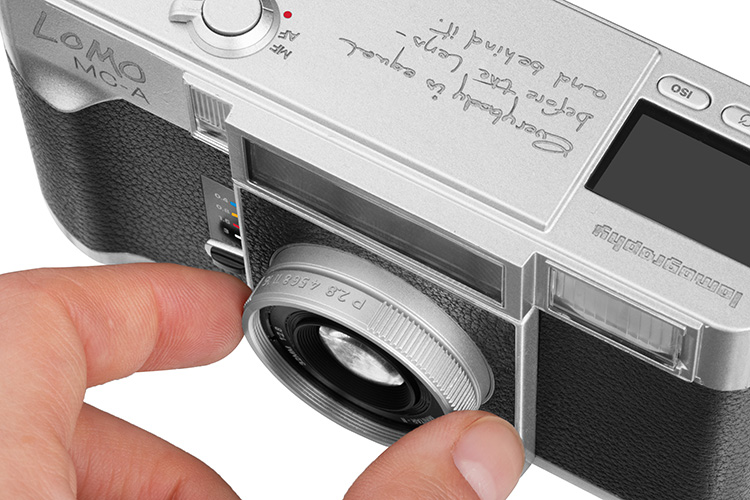 Deckkappe der neuen Lomo MC-A Analogkamera in Schwarz und Silber mit Gravur.