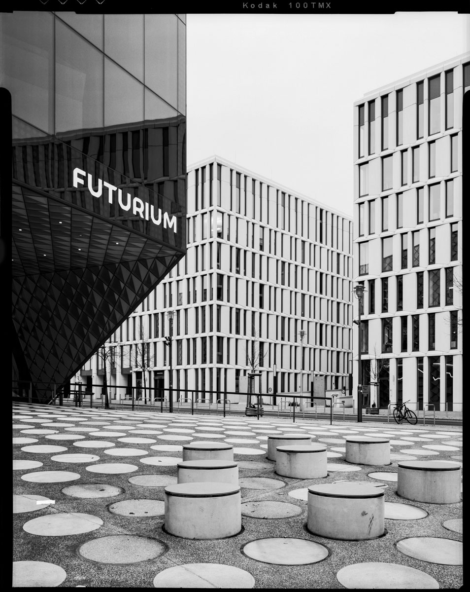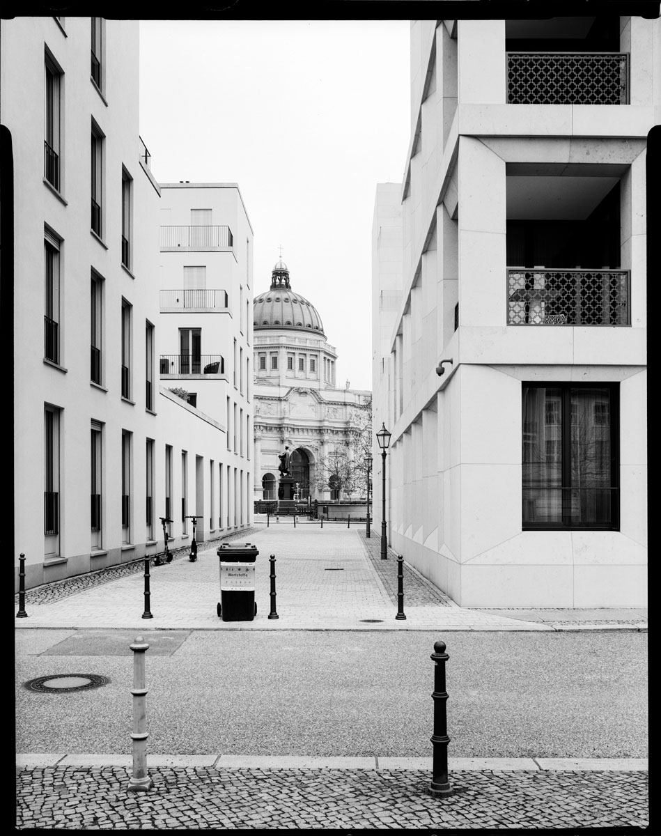 Auf den klassisch in Schwarzweiß gehaltenen Fotos zeigt der Berliner Fotokünstler das Berliner Nebeneinander von Gründerzeit, Nachkriegsmoderne und zeitgenössischer Architektur. Er dokumentiert die Transformation Berlins während einer Zeitenwende, die durch Corona sichtbar wurde. Die Bedingungen von Arbeiten und Wohnen änderten sich, die Bewohner bewegten sich durch eine zeitweise menschenleere und erstarrte Stadt – und träumten von lebenswerten und funktionierenden Stadträumen.