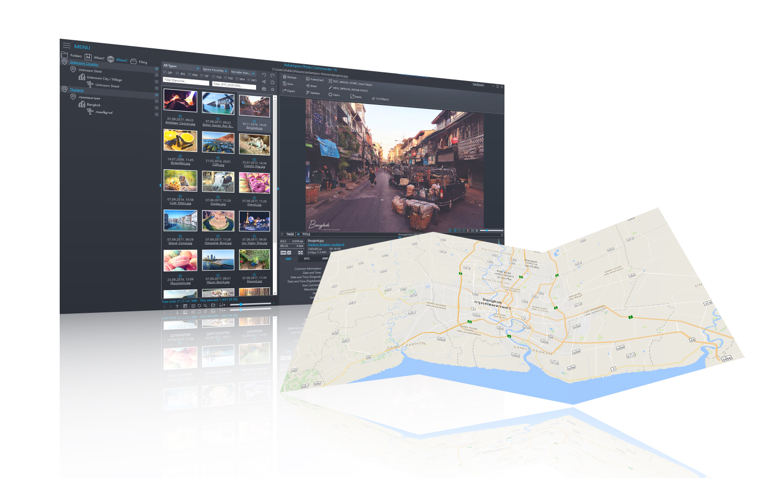 Orts- und Zeitsuche können mit dem neuen Ashampoo Photo Commander 16 verbunden und damit jedes Foto noch schneller gefunden werden. Die Gruppenansicht ist jetzt absolut flexibel und erlaubt eine blitzschnelle Auswahl von Dateien. Langjährige Fotografen können sich über die neue Jahrzehnt-Darstellung freuen. IPTC- und EXIF-Daten werden ab sofort in der neuen Statusbar angezeigt, womit die Entwickler den Wünschen vieler Anwender gerecht werden. Dies trifft auch auf die stark beschleunigte Suche nach doppelten Dateien zu. Nun ist es zudem möglich, mehrere Seiten in nur einem Durchlauf zu scannen und in mehrseitige PDF-Dateien zu konvertieren. Außerdem wurde die Zoom-Funktion schneller.
