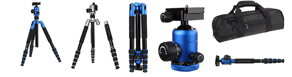 Die Mittelsäule ist mit einem integrierten, gefederten Lasthaken ausgestattet. Die Gummifüße sind ideal für empfindliche Untergründe. Die im Lieferumfang befindlichen Stahlspikes sorgen für festen Halt auf unebenen Böden. Für bodennahe Aufnahmen wird die Grundplatte mit dem Kugelkopf auf den mitgelieferten Montagekonverter montiert. so wird eine minimale Aufnahmehöhe von 21 cm erreicht. Die Stative gibt es in den Farben Blau und Silber,
