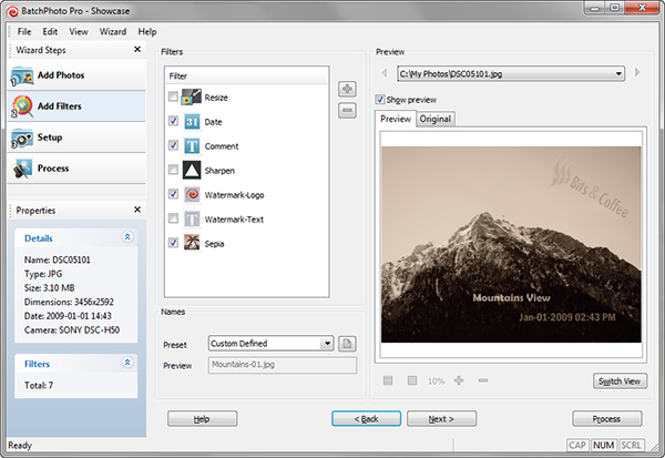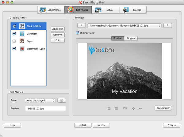Oft sind Fotos, so wie sie aus der Kamera kommen noch nicht perfekt und müssen noch nachbearbeitet werden. Bits&Coffee BatchPhoto hilft iin solchen Fällen mit einer schnellen Batch-Bildbearbeitung Zeit zu sparen. Das Programm ist für Fotografen, Web-Designer, Geschäftsleute und Familien gedacht, die ihre Bilder schnell und effizient nachbearbeiten möchten. Dazu wird einfach eine Anzahl von Fotos ausgewählt, um anschließend mehrere Funktionen gleichzeitig auf diese Bilder anzuwenden. Die Software kann zudem die Bilder anschließend in einem Rutsch auf eine bestimmte Größe bringen, verschiedene Spezialeffekte anwenden, den Dateien neue Namen geben und das Ergebnis in einem anderen Format speichern.Das Programm ist bereits mit den neuesten Betriebssystemen wie Mac OS X Mountain Lion (10.8) oder Windows 8 zu verwenden.