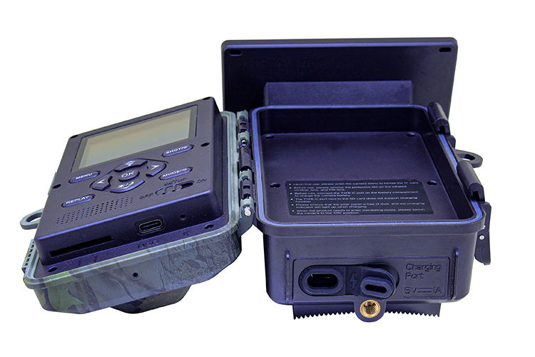 Das Gehäuse ist nach IP66 geschützt und für Temperaturen von minus 20 bis plus 60 Grad Celsius ausgelegt. Die Abmessungen liegen bei 163 × 112 × 76 mm, das Gewicht bei 458 Gramm. Zur Montage sind Gurt, Baumhalterung und ein 1/4-Zoll-Stativgewinde vorgesehen. Öffnungen für Stahlkabelschloss und Vorhängeschloss sowie ein vierstelliger Kennwortschutz ergänzen die Sicherungsoptionen. Zeit, Datum, Mondphase und Temperatur können automatisch ins Bild eingeblendet werden.