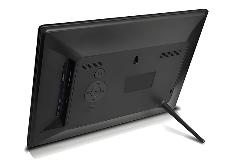 Im Mittelpunkt steht ein 9,7 Zoll großes IPS-Display (24,55 cm) mit LED-Hintergrundbeleuchtung. Die Auflösung liegt bei 1024 x 768 Pixeln im 4:3-Format. IPS-Technik sorgt für stabile Blickwinkel, wodurch Inhalte auch aus seitlicher Perspektive gut erkennbar bleiben. Mit Abmessungen von rund 256 x 208 x 24 Millimetern ist das Gerät auf typische Einsatzorte wie Sideboard, Regal oder Schreibtisch ausgelegt.