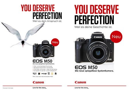 Nun ist Canon seit langem erstmals wieder mit einer groß angelegten Produktkampagne in Deutschland, Österreich und der Schweiz präsent. Wenn auch mit einem englischen Claim: Unter dem Motto „You Deserve Perfection“ und einer kreativen Umsetzung, die das Produkt in den Vordergrund stellt und jeweils mit einem korrespondierenden Bild verknüpft, glaubt Canon eine aufmerksamkeitsstarke crossmediale Launch-Kampagne zu starten, welche die verschiedenen Zielgruppen präzise, effektiv und nachhaltig anspricht.
