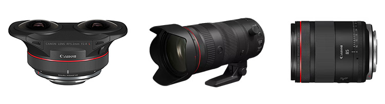 Canon RF-Objektiv-Meilensteine: RF 5.2mm F2.8 L Dual Fisheye (Dezember 2021), RF 24-105mm F2.8 L IS USM Z, abgebildet mit Power-Zoom-Adapter, Dezember 2023), RF 85mm F1.4 L VCM (September 2025).