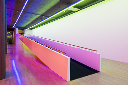 Im Kunstbau bestückte Flavin die vier an der Decke verlaufenden Lichtschienen mit Bändern aus Leuchtstoffröhren in den Farben Grün, Blau, Gelb und Pink. Die leichte Krümmung der Architektur lässt an die Schienen des unter dem Kunstbau befindlichen U-Bahnhofs denken. Das Licht bewirkt differenzierte Farbprojektionen auf Boden, Wände und Einbauten – aber auch das Publikum. Ohne die Architektur zu verstellen, erzeugt Flavins Installation neue Akzentierungen und Wahrnehmungsmöglichkeiten des Raums.