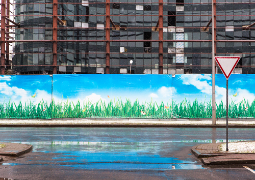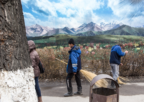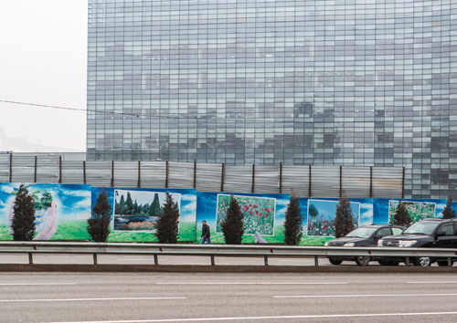 Die Serie Virtual Landscapes entstand als Teil eines dokumentarischen Langzeitprojekts zur Kultur Kasachstans. Bei seinen ersten fotografischen Recherchen im Land fand Dieter Seitz 2009 an zahllosen Orten jene Blechwände vor, die wie überall auf der Welt vor allem Baustellen absichern sollen. In Kasachstan kommt ihnen ferner die Funktion zu, jüngst erlangten Privatbesitz zu schützen, Industriebrachen, Investitionsruinen und andere Unorte dem Blick der Öffentlichkeit zu entziehen. Fünf Jahre später sind diese Blechwände besonders in der aufstrebenden neuen Hauptstadt Astana fast völlig verschwunden – hinter schneebedeckten Bergen und karger Steppe, hinter saftigen Wiesen und endlosen Birkenwäldern. In einem quasi verkehrten Potemkinschen Projekt wird die Naturkulisse zum Element einer Neuinszenierung des Urbanen. Dieter Seitz dokumentiert, wie Fiktion und Wirklichkeit sich dabei verschränken. Zugleich aber treibt er deren Interaktion mit Mitteln der Fotografie weiter und macht sie in seinen Bildern zu einem Vexierspiel der Erscheinungsebenen.