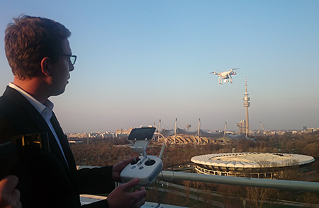 Phantom 3 Flug vor der Kulisse des Münchner Olympia-Geländes.