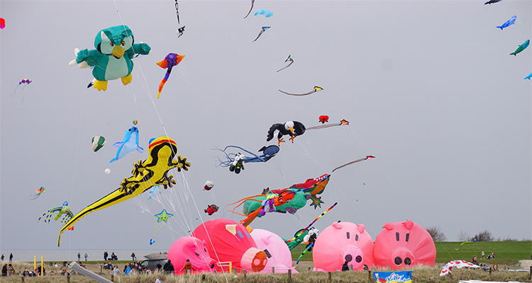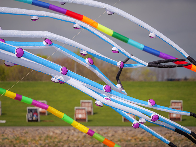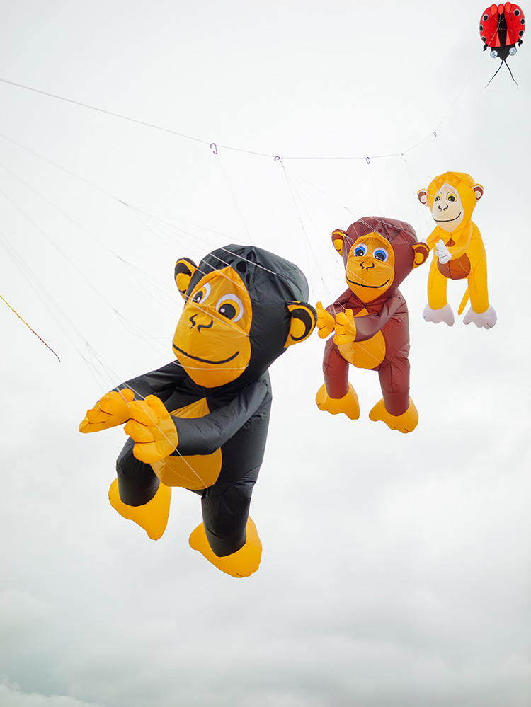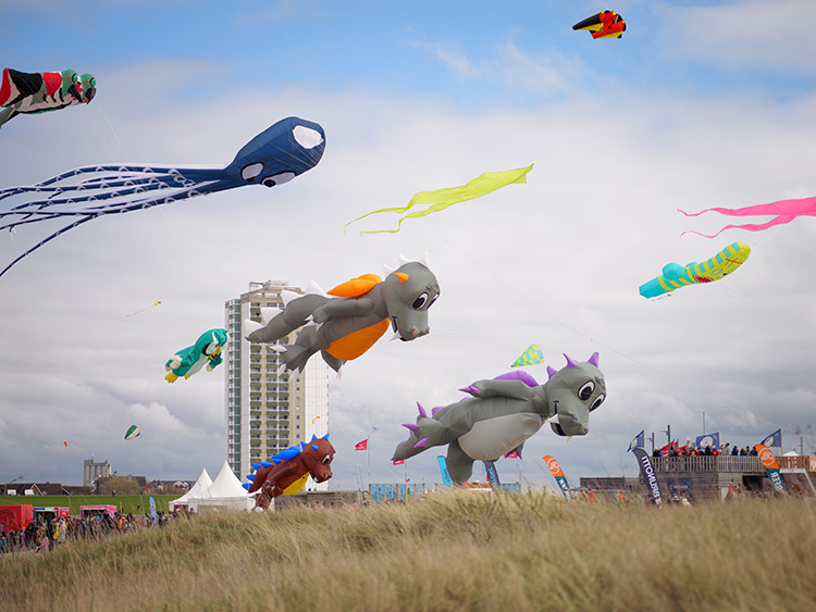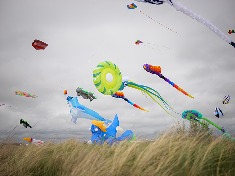 Aus fotografischer Sicht bietet die Veranstaltung eine hohe Motivvielfalt auf engem Raum. Neben klassischen Lenkdrachen sind großformatige Standfiguren in der Luft zu sehen, die durch ihre Dimension und Gestaltung klare Bildanker bilden. Ergänzt wird dies durch die offene Küstenlandschaft, die mit Horizontlinien, Wolkenstrukturen und wechselndem Licht zusätzliche Bildebenen schafft.