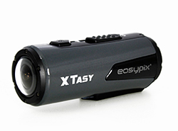 Die Easypix XTasy ist mit einem 170° Weitwinkelobjektiv ausgestattet und filmt in Full-HD Qualität mit einer Auflösung von 1920x1080p bei 30 Bildern pro Sekunde. Bei einer HD Auflösung von 1280x720p kann die Easypix XTasy sogar 60 Bilder pro Sekunde aufnehmen. Fotos können mit bis zu 5 Megapixel geschossen werden. Durch das stabile und geschlossene Aluminiumgehäuse ist die Action-Cam sehr widerstandsfähig und wasserfest bis zu einer Tiefe von 10 Metern. Sie besitzt einen HDMI-Ausgang und kann somit direkt an Computer oder Fernseher angeschlossen werden. Zur Speicherung bzw. zum Datentransfer können externe MicroSDHC-Karten bis zu 32GB eingesetzt werden. Zum mitgelieferten Zubehör der Easypix XTasy gehören eine Fahrrad- und eine Helmhalterung. Die Zweiknopf-Bedienung macht den Einsatz der Easypix XTasy dabei sehr einfach. Für die Stromversorgung ist die integrierte und wieder aufladbare 1200mAH Lithium-Ionen Batterie zuständig, die eine Aufnahmedauer von bis zu 2,5 Stunden ermöglicht.