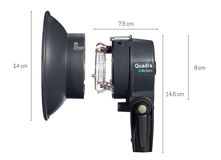 Abmessungen des Quadra Action Blitzkopfes für die mobile Fotografie in Studioqualität.
