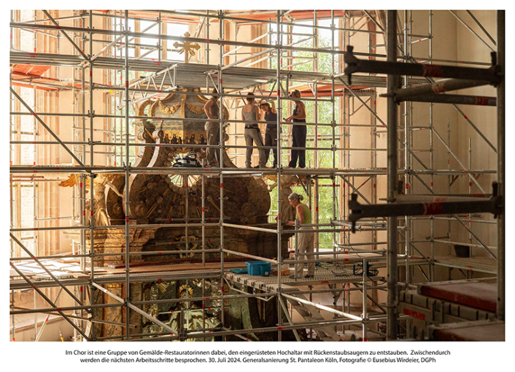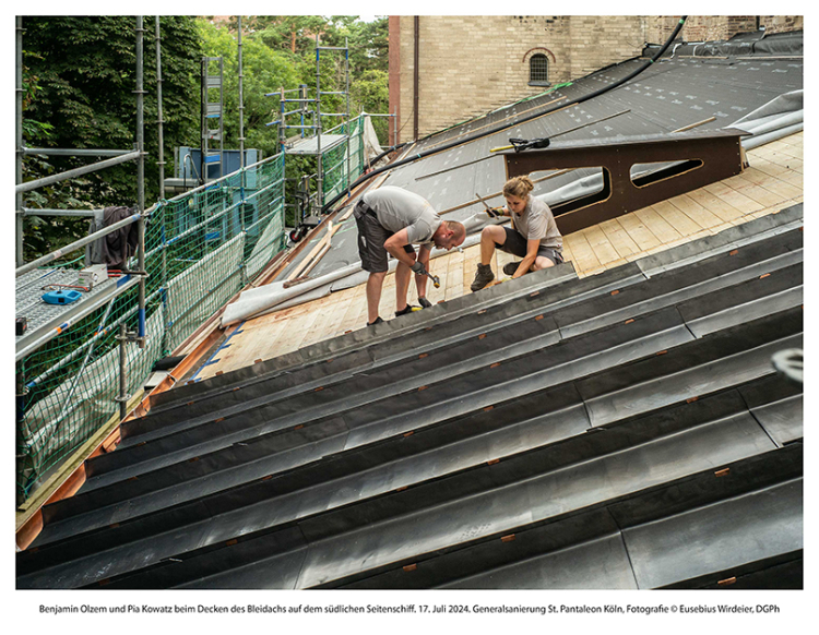 Als die Entscheidung, die Generalsanierung des historischen Gebäudes von St. Pantaleon anzugehen, gefallen war, wurde ein Fotograf gesucht, der die Arbeiten über die folgenden Jahre begleiten und dokumentieren sollte. Die Wahl fiel auf Eusebius Wirdeier (DGPh), der die im Frühjahr 2020 beginnenden Arbeiten fortan mit der Kamera begleitete. Das von deren Freundeskreis nun nach Beendigung der Arbeiten herausgegebene Buch „Sankt Pantaleon Köln – Generalsanierung 2020– 2025“ zeigt in insgesamt 104 zumeist doppelseitig wiedergegebenen Farbfotografien seine Auswahl aus fünfeinhalb Jahren Arbeit.