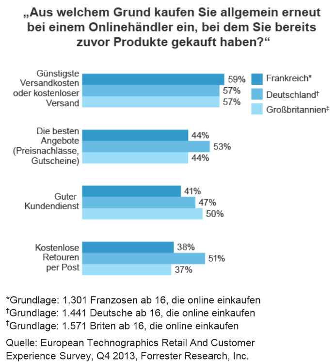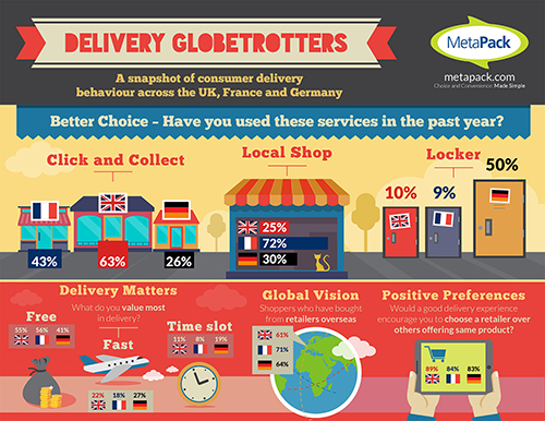 Nach den Ergebnissen der Studie erwarten Versandhändler in allen drei Ländern steigende Investitionen in Versandprozesse. Besonders in UK setzen Händler bereits verstärkt auf neue Versandangebote. Optionen wie die Zustellung am nächsten Tag (Deutschland 73 Prozent, Frankreich 88 Prozent, Großbritannien 83 Prozent) und die Abholung der online bestellten Ware im Ladengeschäft (Click and collect, jeweils 60 Prozent) stehen dabei im Fokus.