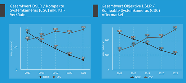Der Gesamtmarkt Digitalkameras war im vierten Quartal 2021 deutlich rückläufig. Das zeigt sich in den vom Photoindustrie-Verband (PIV) und GfK veröffentlichten Marktzahlen, die für 2021 im Vergleich zum Vorjahr, einen Rückgang von rund 16,6 Prozent in der Menge und von rund 6 Prozent im Wert ausweisen. Allerdings setzte sich der Trend zu mehr Qualität beim Kamerakauf sowie zu Investitionen im Bereich Bewegtbild fort. Das zeigte sich vor allem im Segment kompakte Systemkameras (CSC), dessen Wert im Vergleich zum Vorjahr um rund 10,5 Prozent gewachsen ist. Ein deutliches Nachfrageplus verzeichneten auch hochpreisige Objektive, insbesondere CSC-Objektive. Diese legten sowohl in der Menge (+ 10,5 %) als auch im Wert (+ 23,4 %) zu. Auch der Verkauf von Sofortbildkameras und Filmen entwickelte sich weiterhin zufriedenstellend. Hier konnte das starke Umsatzniveau aus dem Vorjahr trotz erschwerter Marktbedingungen gehalten werden.