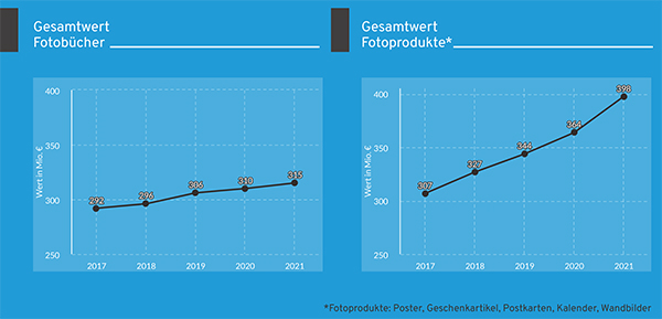 Der Bereich Fotofinishing erwies sich auch im Jahr 2021 als verlässliche Konstante. Besonders im Weihnachtsgeschäft waren hochwertige Print-Produkte wieder stark gefragt. Das führte sowohl im Geschäftsfeld Fotobücher (+ 1,7 % im Wert, rd. 315 Mio. Euro Umsatz) als auch bei Fotoartikeln wie Wandbildern, Kalendern, Grußkarten etc. (+ 9,3 % im Wert, rd. 398 Mio. Euro Umsatz) zu einem positiven Ergebnis im Geschäftsjahr 2021. Hier zahlte sich aus, dass Fotodienstleister frühzeitig die Transformation in digitale Geschäftsmodelle vorangetrieben haben: Der allergrößte Teil der Fotoprodukte wird heute online oder mobil über Apps bestellt.