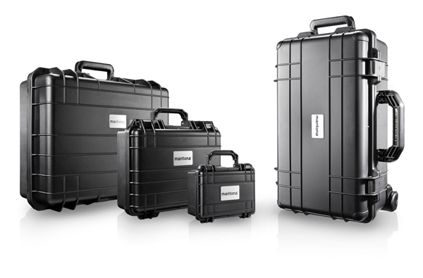 Der „mantona Outdoor-Schutztrolley“ ist der größte Koffer im Sortiment. Er besitzt die Außenmaße 54 cm x 33 cm x 20 cm. Mit dem ausziehbaren Griff lässt er sich auf zwei Rollen bequem ziehen. Der Trolley oder auch der „mantona Outdoor-Schutzkoffer L“ bieten ausreichend Platz für eine Kamera sowie mehrere Objektive und weiteres Zubehör. Der „mantona Outdoor-Schutzkoffer M“ ist 32,5 cm x 26 cm x 11 cm groß. Der kleinste Koffer im Sortiment, der „mantona Outdoor-Schutzkoffer S“ eignet sich für den Transport eines Belichtungsmessers oder einer externen Fest-platte.