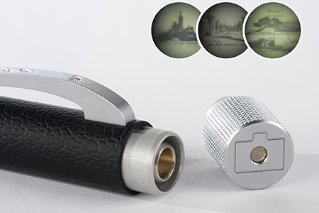 Als eine zusätzliche Besonderheit ist jedes einzelne Exemplar mit einem Original Stanhope und einer 2mm Foto-Linse aus den 50er Jahren bestückt. Nach dem Öffnen des Kamera-Drehknopfs gewährt die Linse den Durchblick auf ein historisches Mikro-Foto mit einem französischen Städtemotiv dieser Ära.