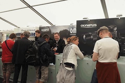 Das ist aber nicht das Einzige was der Hauptsponsor Olympus am Fotomarkt zu bieten hat: Neben der Vorstellung von PEN – und OM-Kamerasystemen, Objektiven und Zubehör, gibt es auch eine kostenlose Ausleihe von Equipment. Wer einen Überblick des Marktes und der Umgebung haben möchte, der kann den Olympus Turm erklettern und von oben mit den dort platzierten Ferngläsern das Geschehen erkunden.