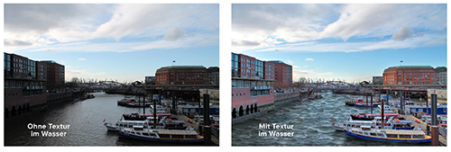 Einzelne Bildteile wie beispielweise Himmel, Untergrund oder Fassaden lassen sich durch neue Texturen beziehungsweise Masken interessanter gestalten. Die nach Kategorien geordneten Masken können entsprechend der Perspektive angepasst werden, um realistische Bildergebnisse zu erhalten, die sich ohne das Exportieren in andere Programme drucken lassen.