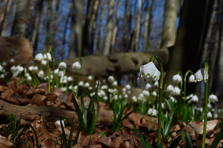 Wenige Tage später entfalten sich im Nationalpark Hainich Buschwindröschen und Märzenbecher in ausgedehnten Buchenwäldern. Das noch lichte Blätterdach lässt viel Sonnenlicht auf den Boden fallen und ermöglicht kontrastarme Waldszenen mit großer Tiefenwirkung.