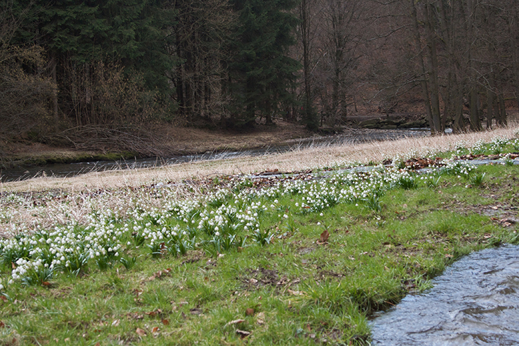 Den Abschluss der Route bildet Sachsen. Im Polenztal erscheinen Märzenbecher entlang eines Bachlaufs im Wald. Das Zusammenspiel aus Wasser, Felsen und weißen Blüten schafft ruhige Naturstudien. Wenig später zeigen sich in Drebach großflächige Krokuswiesen im Erzgebirge. Hier lassen sich mit erhöhtem Standpunkt weite Farbflächen einfangen, während im Gegenlicht einzelne Blüten hervortreten.