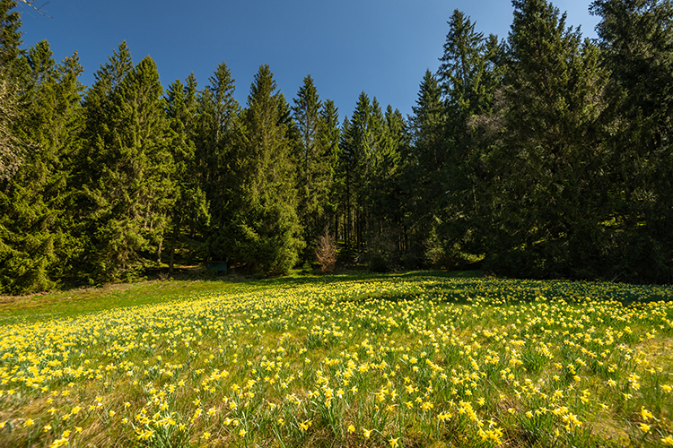 Anfang April erreicht die Reise die Eifel. Im Nationalpark Eifel blühen Narzissen auf weiten Wiesen im Monschauer Heckenland. Gelbe Felder ziehen sich durch sanfte Täler und bilden Linien im Gelände, die sich kompositorisch nutzen lassen. Wanderwege erlauben wechselnde Standpunkte, vom erhöhten Überblick bis zur bodennahen Detailaufnahme.