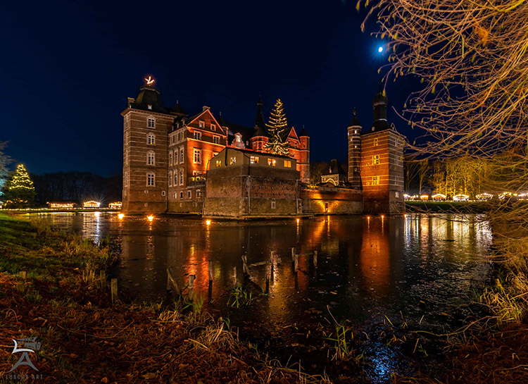 Der Weihnachtsmarkt im Schloss Merode gilt als einer der romantischsten in Deutschland. Feuerstellen, Wassergraben und Schlossreflexionen schaffen eine einmalige Stimmung – perfekt für stimmungsvolle Nachtaufnahmen.
