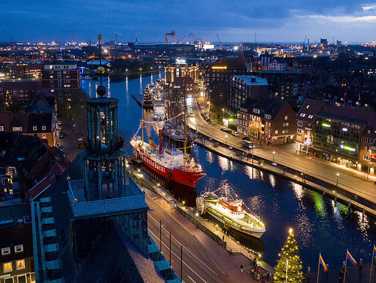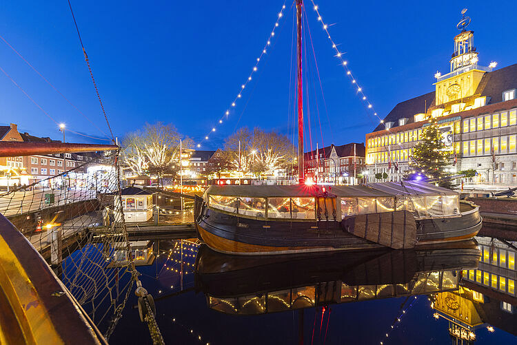 Norddeutsche Weihnachtsromantik trifft auf Hafenflair: Lichterglanz, Museumsschiffe und Buden entlang des Ratsdelfts machen den Engelkemarkt einzigartig.