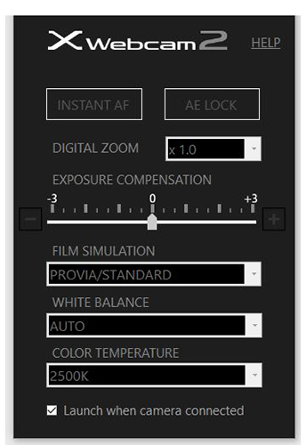 Sobald die X Webcam App auf Ver.2.0 aktualisiert ist, muss das X Webcam 2 Tool gestartet werden, um das Einstellungsfenster zu öffnen. Dort lassen sich Kamerafunktionen, wie der Filmsimulationsmodus wählen, der Instant AF aktivieren, AE sperren oder die digitale Zoomvergrößerung, Belichtungskorrektur und der Weißabgleich einstellen.