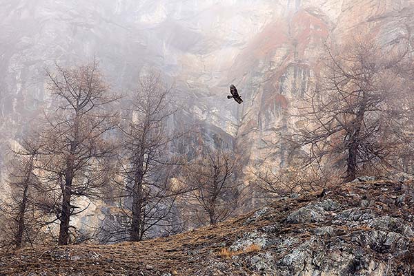 bieten den Steinadlern eine ergiebige Nahrungsquelle nach der Schneeschmelze. Bei aufklarender Witterung kann man sie dann häufig gut beobachten. Doch das Wetter in den Alpen ist unberechenbar. Zwei Tage später sollten in dieser Region innerhalb von 48 Stunden zwei Meter Neuschnee fallen und damit das Futterangebot der Steinadler für die folgenden Tage und Wochen wieder stark einschränken,“ so erklärt Maximilian Horbach (Jg 96) sein Siegerbild.
