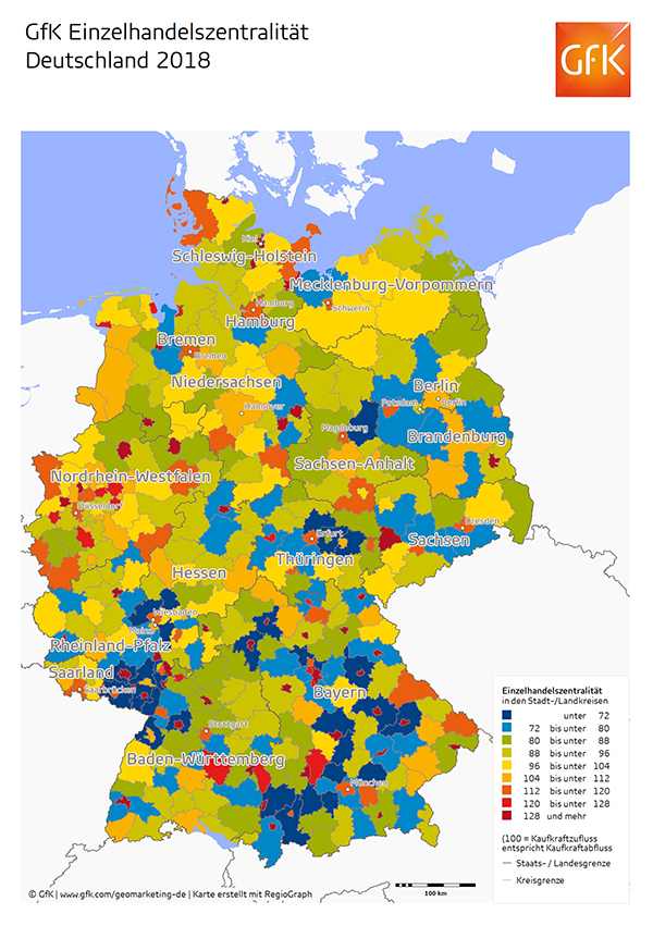Die Studie „GfK Einzelhandelszentralität“ zeigt, welche Regionen dank Kaufkraftzuflüssen von überdurchschnittlichen stationären Einzelhandelsumsätzen profitieren beziehungsweise wo Kaufkraftabflüsse zu verzeichnen sind. Vergleicht man die Einzelhandelskaufkraft mit regionalen Einzelhandelsumsätzen, ergibt sich die Kennziffer Einzelhandelszentralität, die die Anziehungskraft des regionalen Einzelhandels misst. Werte über 100 stehen für einen Kaufkraftzufluss, Werte unter 100 für einen Kaufkraftabfluss. Im Jahr 2018 stehen 150 deutsche Kreise mit Kaufkraftzufluss insgesamt 251 Kreisen mit Kaufkraftabfluss entgegen. Allerdings liegt es in der Natur des Einzelhandels, dass überwiegend Stadtkreise Zuflüsse verzeichnen, denn hier ballt sich der Einzelhandel und hat eine hohe Anziehungskraft auf die im Umland lebenden Konsumenten.