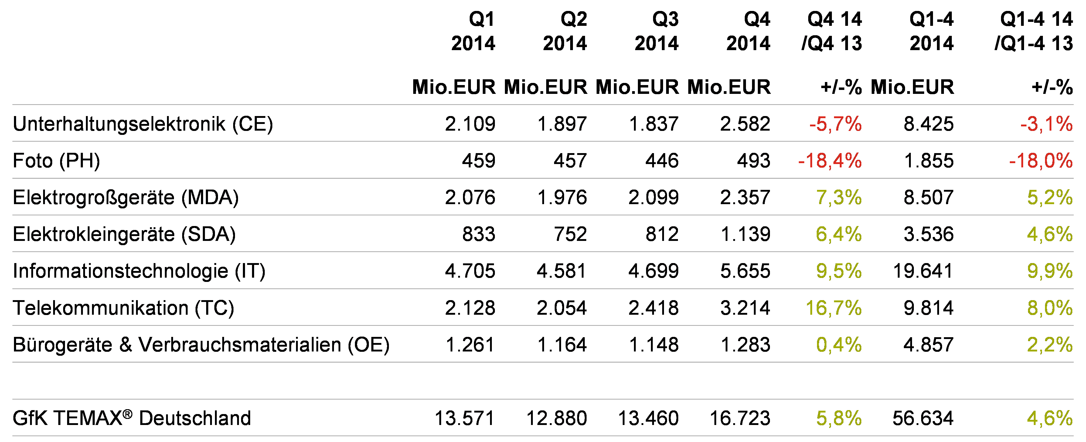 Obwohl es für die Unterhaltungselektronik ein Jahr mit vielen Innovationen war, musste der deutsche Markt für Unterhaltungselektronik in 2014 einen Umsatzrückgang von 3,1 Prozent auf 8,4 Milliarden Euro hinnehmen. Dennoch zeigte sich laut GfK der Gesamttrend vielversprechender als im Vorjahr. Vor allem im Bereich TV gab es viele Innovationen, die Impulse setzten. Ultra-HD-Modelle, gekrümmte Fernseher, Smart TV und OLED-Technik schafften wachsende Nachfrage. Aufgrund weiter sinkender Durchschnittspreise hinkte die Umsatzentwicklung jedoch hinterher.