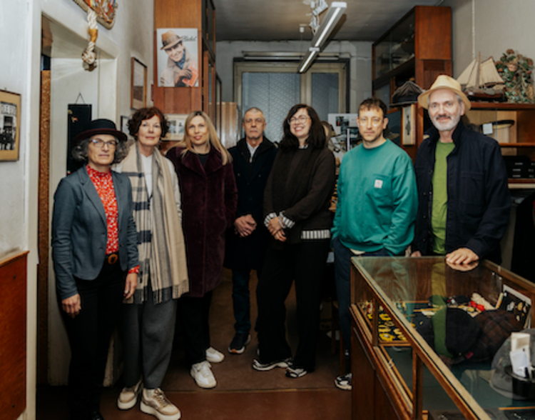 Wer hier die Hüte auf hat ist ziemlich klar! Die achtköpfige gute aussichten 2025/2026 Jury im Dezember 2025 in Hamburg (v.l.): Katrin Seidel (Kuratorin Landesmuseum Koblenz), Josefine Raab (Gründerin & Direktorin gute aussichten), Stefanie Patruno (Direktorin Kunstmuseum Karlsruhe), Stefan Becht, Amélie Schneider (Bildchefin Die Zeit), Holger Jenss (Künstler & gute aussichten Preisträger) und Thomas Struth (Künstler & Fotograf). Nicht im Bild, weil in Japen, die Jurorin Frauke Schnoor (Foto: Jewgeni Roppel)