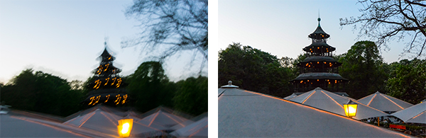 Aufnahme aus der Hand links ohne und rechts mit Nachtaufnahme im Kreativmodus.
