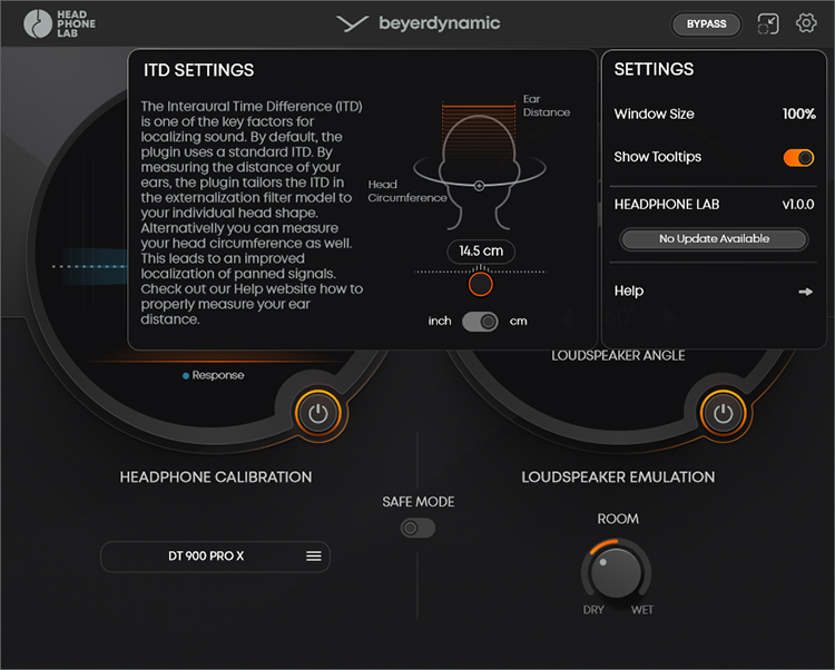 Das Plug-in bietet zusätzliche Einstellmöglichkeiten zur individuellen Anpassung. Ohrabstand und Kopfumfang lassen sich ebenso konfigurieren wie der virtuelle Lautsprecherwinkel mit 40, 60 oder 80 Grad. Optional kann eine Raumsimulation aktiviert werden, die eine konstante Referenzumgebung erzeugt.