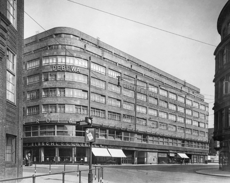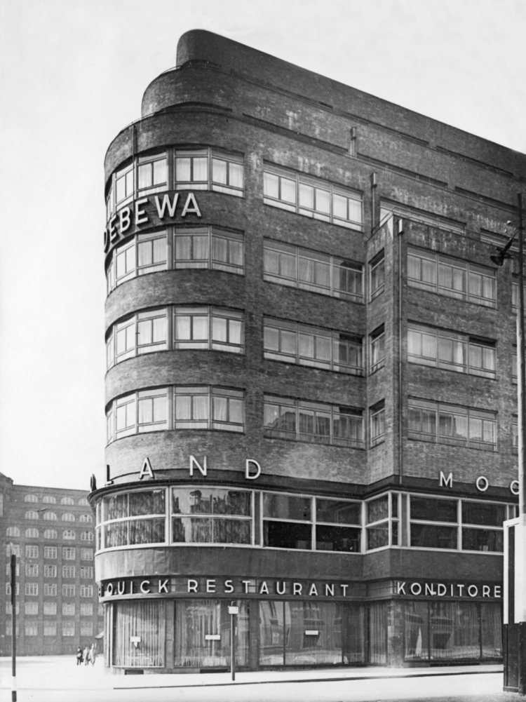 Hamburgs Deutschlandhaus – gestern und heute: Das Deutschlandhaus, das die Architekten Fritz Block (1889 – 1955) und Ernst Hochfeld (1890 – 1985) 1929 entworfen hatten, war Hamburgs erstes Geschäftshaus im Stil der internationalen Moderne. Es enthielt Büros, Läden und Restaurants sowie den Ufa-Palast, das damals größte Kino Europas.