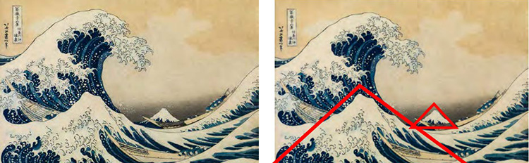 Hokusais Kunst ist von einer außergewöhnlichen Präzision geprägt. Jede Linie, jede Fläche ist bewusst gesetzt. Seine Bildkompositionen sind trotz der Fülle an Details meist klar strukturiert. Das Weglassen überflüssiger Elemente und das geschickte Platzieren von Haupt- und Nebenmotiven kann auch beim Fotografieren die Bildaussage stärken. Hokusais Arbeiten verdeutlichen, wie wichtig eine klare Blickführung ist, die er durch diagonale Achsen, Symmetrie oder bewusst gesetzte Kontraste beeinflusst.