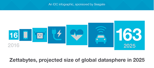 Das Whitepaper Data Age 2025 des Analystenhauses IDC, dessen Erstellung von Seagate unterstützt wurde, prognostiziert ein Anwachsen der weltweit generierten Datenmenge auf insgesamt 163 Zettabyte (ZB) bis 2025. Dies lässt den Schluss zu, dass der Schwerpunkt der letzten zehn Jahre, der auf der Konvertierung von analogen zu digitalen Daten lag, zunehmend durch einen Fokus auf den Mehrwert von Daten ersetzt wird. Dazu gehört die Generierung, Nutzung und Verwaltung ‚lebenskritischer‘ Daten, die für das reibungslose Funktionieren von Gesellschaft, Verwaltung und Wirtschaft gleichermaßen notwendig sind. Die Zahl der Verbraucher und Unternehmen, die mit den verschiedensten Endgeräten und in der Cloud Daten erzeugen, teilen und abrufen, wird weiterhin wachsen und frühere Prognosen weit übertreffen.