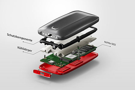 Die Portable SSD X5 verfügt über ein robustes Metallgehäuse mit rutschfester Bodenmatte. Der zusätzliche stoßfeste Innenrahmen schützt die SSD vor Stürzen aus bis zu zwei Metern Höhe5. Die Dynamic Thermal Guard Technologie und ein Kühlkörper – eine mechanische Innenlösung – bieten zusätzlichen Schutz vor Überhitzung und sorgen für optimale Betriebstemperaturen. Die X5 bietet einen optionalen Passwortschutz, der die AES-256-Bit-Hardware-Verschlüsselung aktiviert. Dieses Passwort kann mit der zugehörigen Software jederzeit geändert, oder je nach Bedarf auch deaktiviert werden.