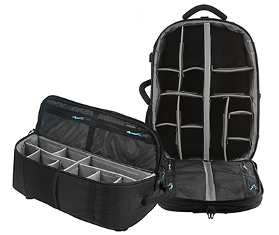 Der Bataflae Fotorucksack halb und ganz geöffnet.