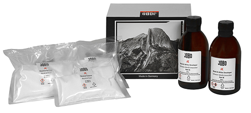 Der Jobo Alpha ist ein Universalentwickler und eignet sich durch Anpassung der Entwicklungszeit für alle gängige SW-Filme. Die SW-Chemie von Jobo ist ab dem 01. Dezember 2022 verfügbar. Der SW-Entwickler wird in 2 Flaschen zu je 300 ml geliefert. Hiermit werden 6 L Arbeitslösung gemischt, die für 50 Filme ausreicht. Der 6L-Satz wird in formschönen braunen Apothekerflacons aus PET geliefert und kostet etwa 19,00 Euro. Der Jobo Alpha Neutralfixierer wird in praktischer Pulverform ausgeliefert, der im verschlossenen Beutel bei trockener Lagerung über 10 Jahre haltbar ist. Drei separate Beutel für je zwei Liter Arbeitslösung werden in einer Verpackung geliefert und kosten 15,90 EUR. Als Komplettlösung für 50 Filme wird der Jobo Alpha Entwickler zusammen mit dem Jobo Alpha Fixierer für je sechs Liter Arbeitslösung in der Einführungsphase zum Vorteilspreis von 30,00 Euro angeboten. Damit kostet die komplette SW-Filmentwicklung im Heimlabor mit der Jobo Chemie je Film nur knapp 60 Cent.