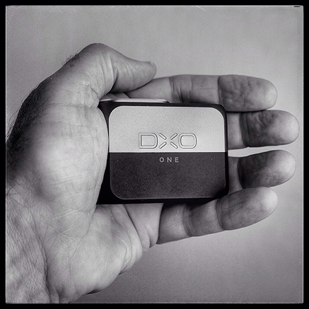 Die ONE ist eine 20.2 Megapixelkamera, die sich voll manuell steuern lässt. Sie ist mit einem hochlichtstarken f/1.8 Weitwinkelobjektiv ausgestattet. Was sie so einzigartig macht ist, die Größe, die kleiner als eine Handfläche ist und dass sie sich mit einem iPhone verbinden lässt. Die Kamera selbst besitzt weder einen Sucher noch einen Bildmonitor. Sie verwendet eine App auf dem iPhone über das man den Bildausschnitt bestimmt und die Einstellungen wie Blende, Verschlusszeit, ISO-Empfindlichkeit, Belichtungskorrektur, Weißabgleich sowie die Methoden für die Blitz- und Dauerlichtmessung vornimmt. Die Bilddateien lassen sich im JPG- und RAW-Format im iPhone oder auf einer microSD-Speicherkarte in der DXO One ablegen. Die Kamera bietet zudem einen speziellen Super RAW Mode für Aufnahmen bei wenig Licht. In dieser Betriebsart nimmt sie vier verschiedene Belichtungen auf, die sie dann automatisch zu einem neuen Bild zusammensetzt.