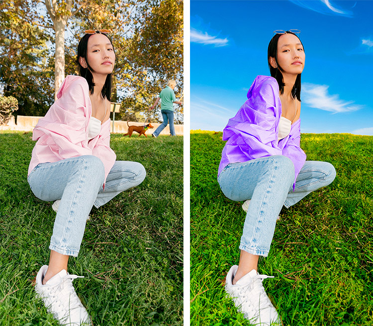 Vorhjer-Nachher Beispiel: Mit den neuen Tools von Adope für Photoshop und den Firefly Image Editor lassen sich Bilder automatisch per Texteingabe bearbeiten.