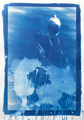 Gänzlich neue Räume schafft Eva-Maria Raab in ihren lake prints, wo die Grenzen zwischen Realität und Abstraktion förmlich miteinander verschmelzen. In der Nacht benetzt sie lichtempfindliches Papier mit Wasser vom Bodensee und lässt die Spuren der Wellen mit fotografischen Aufnahmen des Sees förmlich verschwimmen. Mittels Cyanotypien überlagert sie Objekt und Abbild und erzeugt poetische fotografische Relikte.